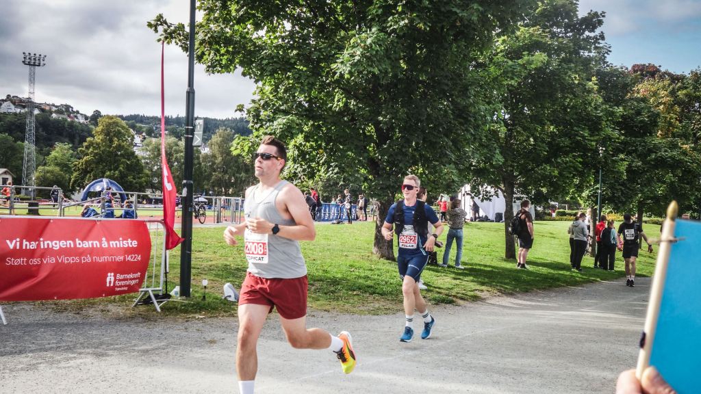 Det tar evigheter, føles det, før jeg klarer å samle meg noenlunde, og i mellomtiden (disse drøøøøye to-tre minuttene) må bare føttene gå, forbi gamle trakter på Ila og mot Ila kirke. Nedover bakken mens lårene skriker, men noe gult løper nede på brua foran meg, og om jeg har måttet grave litt dypere på andrerunden enn planlagt, så gjelder tydeligvis det Gul Buvik i minst like stor grad. Og ikke langt foran er Blå A4. Jeg har løpt meg opp til gruppa mi. Enkle gleder i en kokt hjerne. Rasker til meg en kopp med sportsdrikke på siste drikkestasjon, og kaster den rutinert i øyet. Ingen svamputdelere manifesterer seg denne gangen, så det er med elektrolytt-tårer jeg forsøker å strekke ut stegene på denne siste langsiden før selve finishen. Men det er ikke noe igjen i tanken, ingen evne til å pushe meg selv inn i rødt, og hvis jeg nærmer meg gul og blå så er det centimeter for centimeter. Kikker på klokka med 1 kilometer igjen, og kan etter noen sekunder rasende hjerneaktivitet konstatere at 1:40 kommer til å gå bra omtrent uansett. Og var det ikke det som var målet, du kan GÅ!! roper beina, men jeg vet jo hva hvert sekund og minutt har kostet. Og Gul Buvik holder farta noenlunde oppe tyve-tredve meter lenger framme (Blå A4 hadde tydeligvis en ekstra finish inne), så da må jo jeg også kunne klare 21 i stedet for 20 kilometer i løpstempo. Tjueen komma én, tenker jeg, og stamper over Gamle Bybro. Opp Bispegata, til høyre ved Nidarosdomen, og der! er mållinja og portalen.