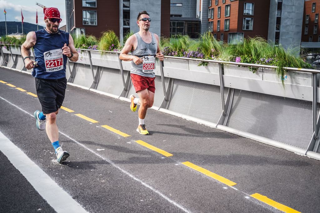 Jeg føler meg frisk og fin til start, nå i pulje 2, puljen for de som akkurat ikke er ordentlig raske, og forventer å løpe mellom 1:30 og 1:40. Det er ei ordentlig mølje ut fra startstreken4, for med disse målsetningene har man jo ikke tid til å sulle rundt all verden på den første kilometeren. Så det er litt tendenser til felttaktikkeri og litt sånn fjellturaktig fokus på hvor man setter føttene hele veien gjennom sentrum, og helt ut til Nyhavna, der det endelig begynner å løse seg litt opp. Flaggene for 1:40 og 1:35 vaier et stykke lenger fremme, godt og offensivt plasserte ved startskuddet som de var. Og det går fort, ser jeg – mellom 4:15 og 4:30 når jeg konsulterer klokka. Pulsen begynner å nikke opp i gul sone allerede. Hmm.