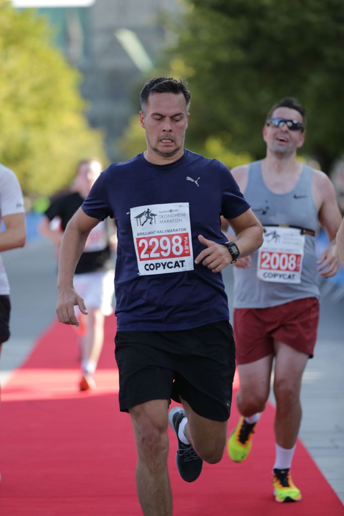 Av en eller annen merkelig grunn stratifiserer ikke Trondheim maratons offisielle sider løperne inn i de prestisjetunge vektkategoriene, så noe offisielt resultat i min hardt tilkjempede 95+-kilosklasse fins dessverre ikke. Litt Strava-magi senere kan jeg likevel konstatere at av de bare 17 tunge Strava-brukerne som stilte til start fikk jeg en finfin og soleklar 3. plass. Hurra! På pallen!11 Gul Buvik gikk i mål noen meter foran meg, men til min meningsløse fornøyelse slo jeg ham likevel med ett sekund, én plass, i mål.